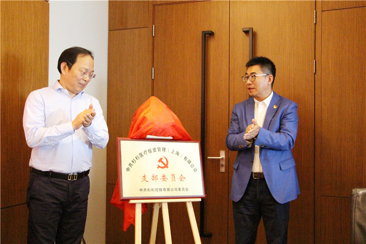 会议在庄严的国歌声中拉开序幕,蒋卫中副书记宣读了上级党委《关于成立中国共产党杉杉医疗投资管理(上海)有限公司支部委员会的批复》,并与杉杉医疗党支部书记、董事长沈波共同揭牌。