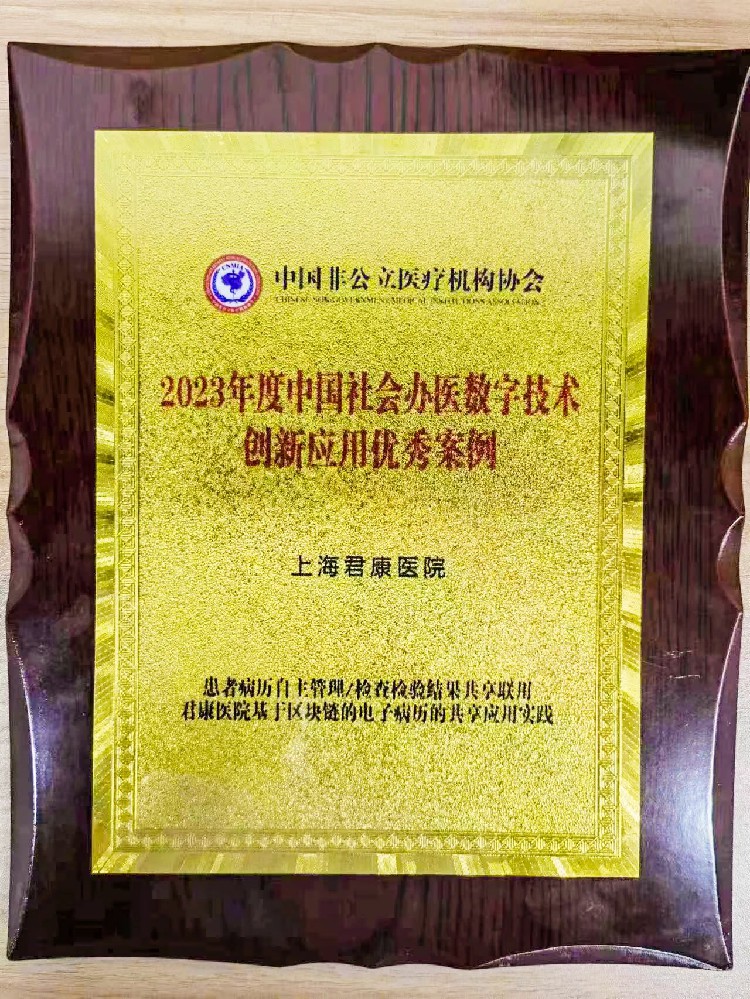 近日,在“2023年度中国社会办医数字技术创新应用优秀案例”活动中,上海君康医院申报的案例《患者病历自主管理/检查检验结果共享联用——君康医院基于区块链的电子病历的共享应用实践》荣获优秀案例,受到非公医疗协会信息专委会的高度赞扬和认可,并在6月10日召开的中国非公立医疗机构协会信息化专业委员会2023年学术年会暨第二届中国智慧健康质量大会上,获得荣誉奖牌。